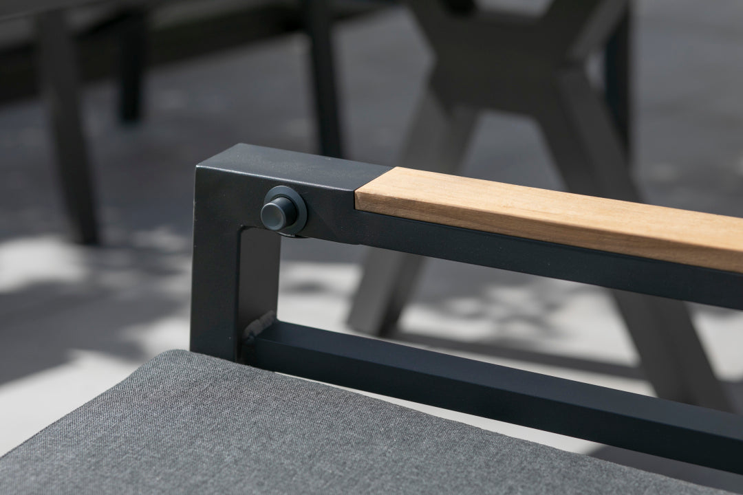Der Sessel besteht aus einem robusten Aluminiumrahmen, der sowohl leicht als auch wetterbeständig ist. Dies macht ihn ideal für den Einsatz im Freien. Die eingelassenen Teakarmlehnen verleihen dem Sessel eine natürliche und warme Note, während sie gleichzeitig einen Hauch von Luxus hinzufügen.