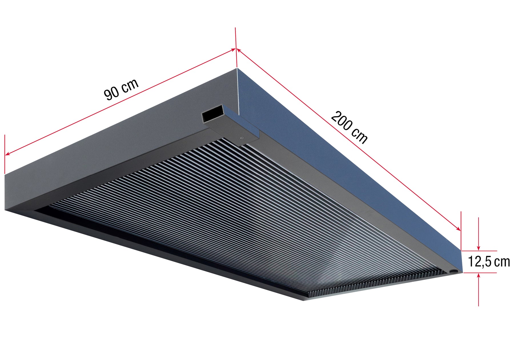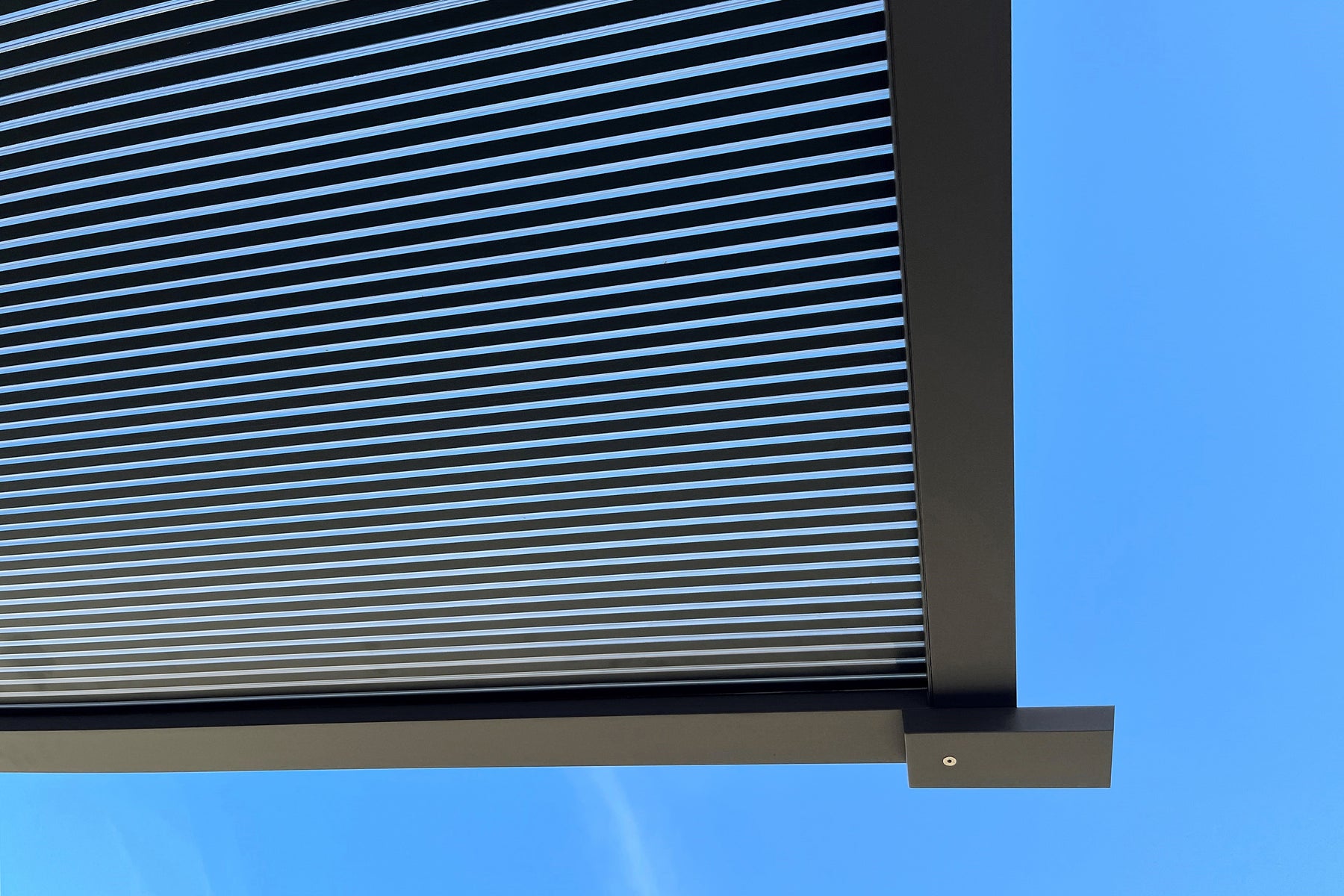 Das neue Vordach verfügt über ein schlichtes kubisches Design aus einer langlebigen Aluminium-Konstruktion, die mit einer Pulverbeschichtung mit matter Feinstruktur versehen ist. Die besondere Raffinesse besteht in der Abdeckung, bei der eine 16 mm starke „Zebraplatte“ zum Einsatz kommt. Die klare Polycarbonat-Stegplatte verfügt über dunkle Längsstreifen, die einen außergewöhnlichen 3D-Effekt kreieren. Sie hält Wind und Wetter zuverlässig fern und kann an heißen Tagen sogar wohltuenden Schatten spenden, wobei sie weiterhin ausreichend Licht hindurchlässt. Eine integrierte Entwässerung verhindert die Ansammlung von Regenwasser.