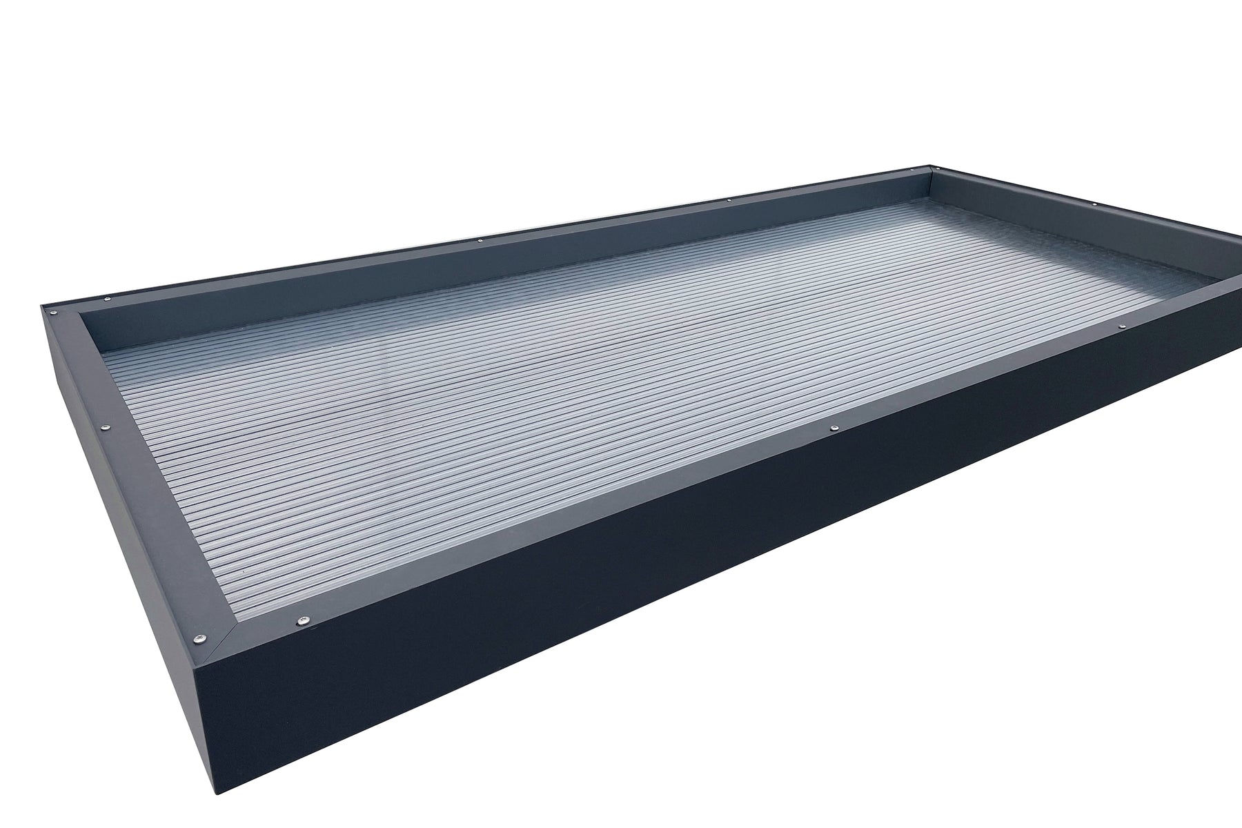 Abdeckung mit 16 mm starker “Zebraplatte” (hagelsichere PC-Stegplatte mit dunklen Streifen)